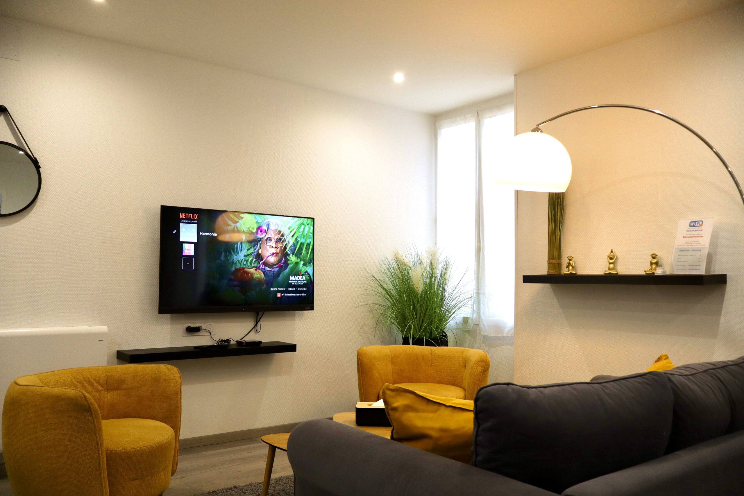 Un salon généreux baigné de lumière naturelle, décoré avec goût. Canapé confortable, télévision connectée et une atmosphère chaleureuse pour des soirées parfaites après une journée à découvrir Lourdes.