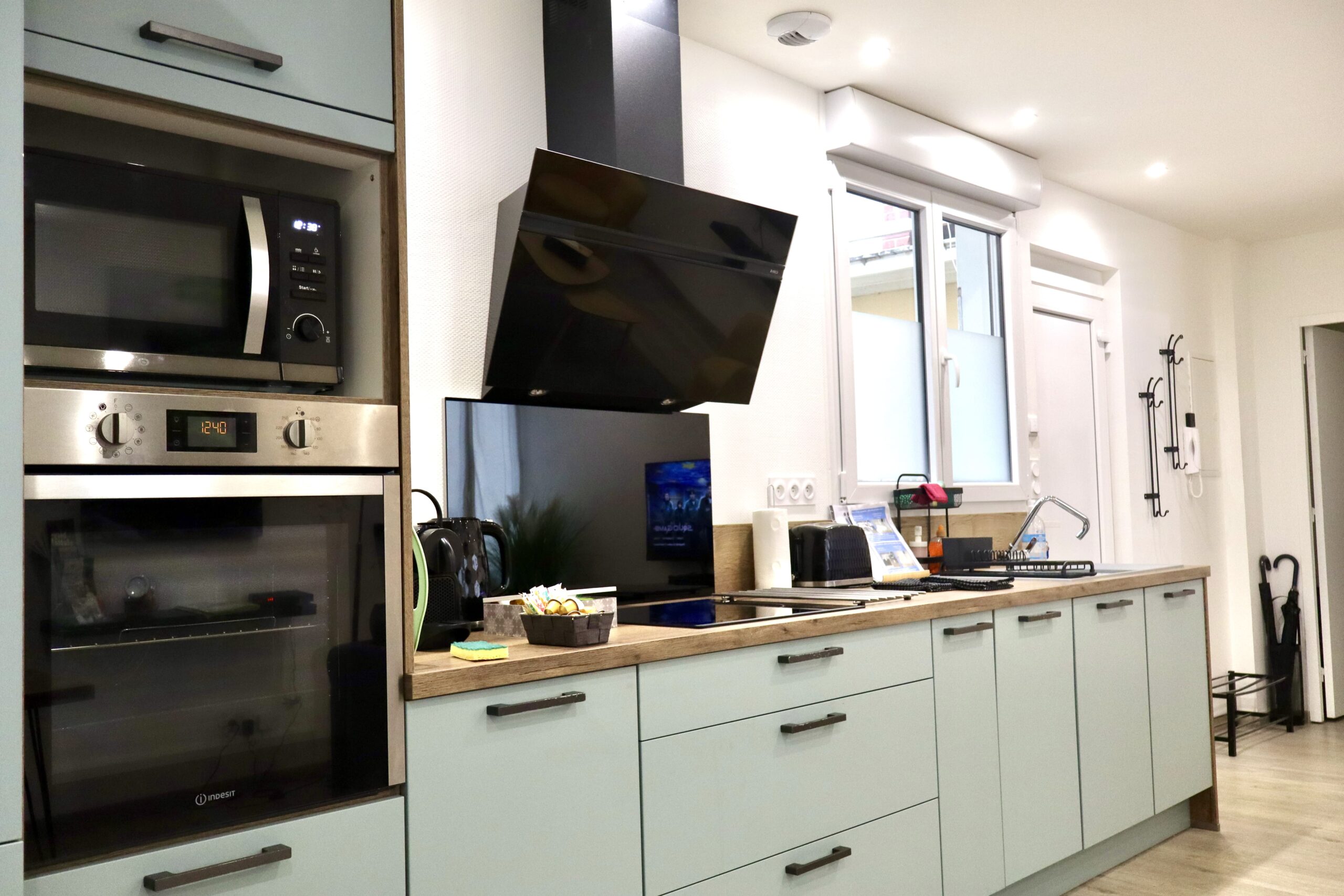Cuisine entièrement équipée pour préparer vos repas comme à la maison. Plaque de cuisson, four, réfrigérateur, micro-ondes et tout l'équipement nécessaire.