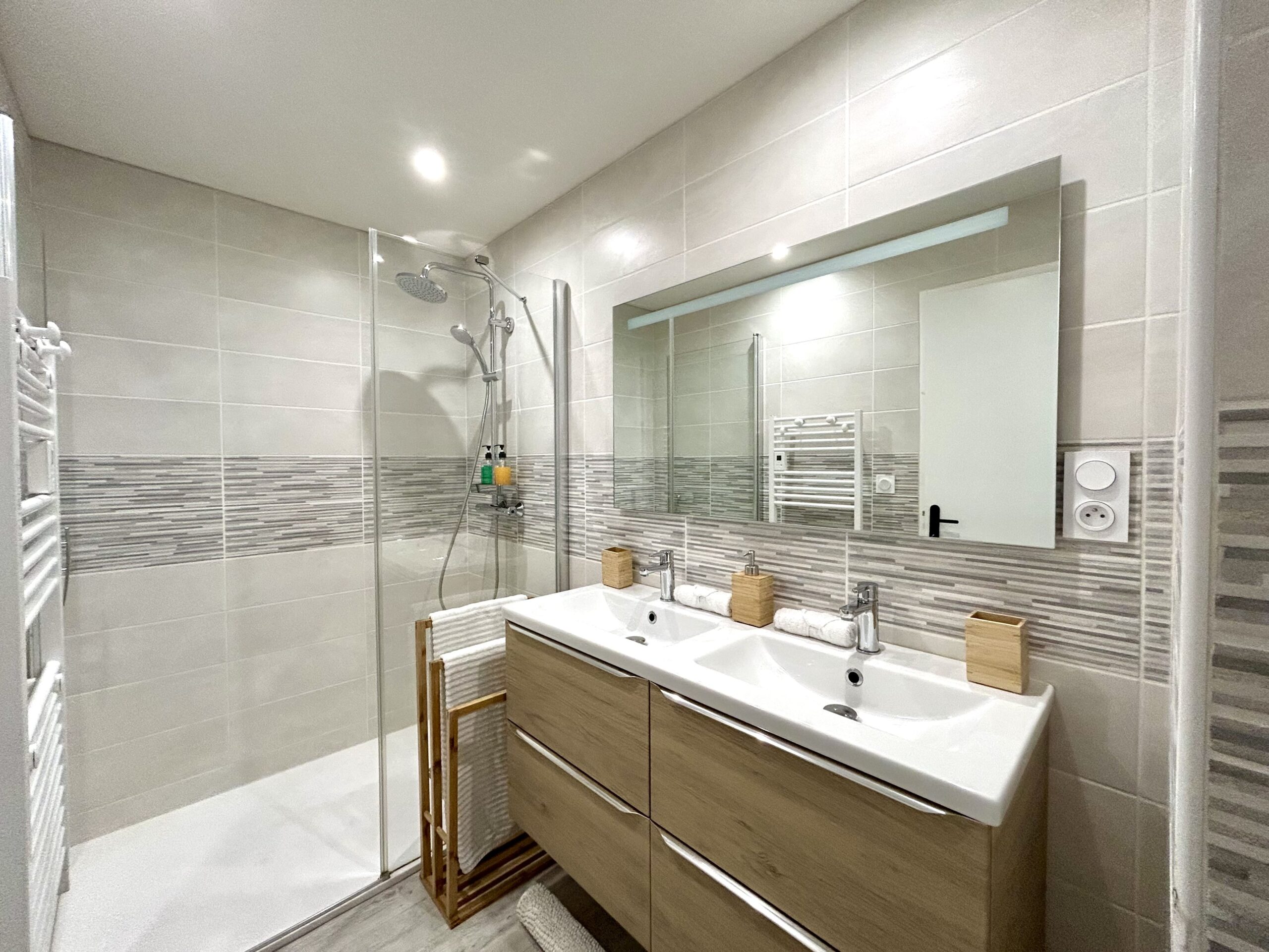 Deux suites parentales, chacune avec son lit double 160×200 et sa salle d'eau privative conçues pour offrir à chaque voyageur son propre espace de détente et d'intimité. Un appartement pensé pour les familles, les duos d'amis ou les couples qui voyagent ensemble sans sacrifier leur confort.